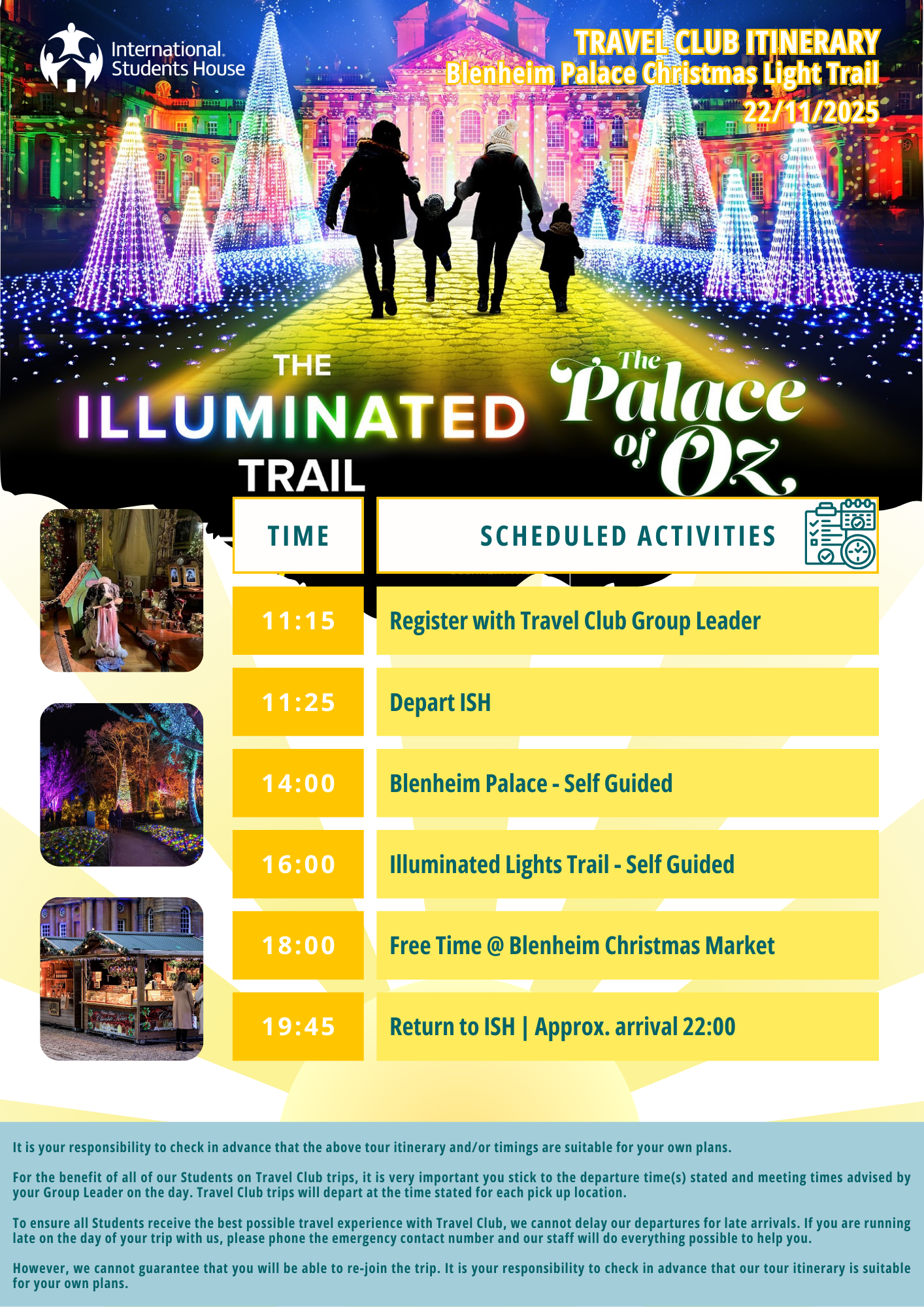 · Please be aware that photography and/or filming will be taking place on all Travel Club Trips for promotional purposes. The photographs and recordings may be used by International Students House for promotional purposes, for example on social media platforms, websites, mobile applications, emails, digital media, or printed materials. If you would prefer not to be photographed or filmed, please speak with your Travel Club Trip Group Leader on the day.
